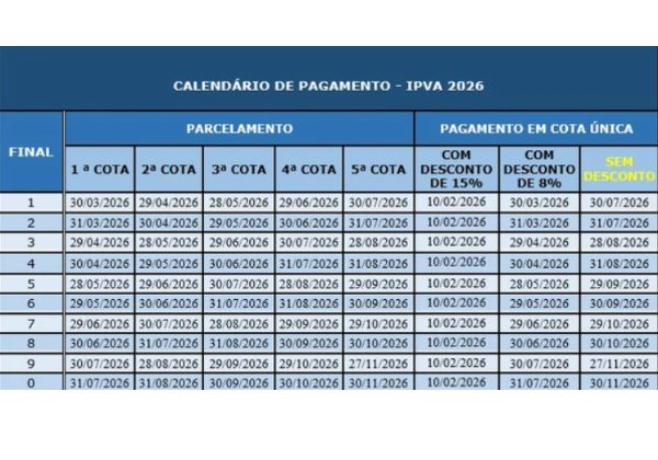 Já os motoristas que preferirem quitar o IPVA em cota única sem desconto terão prazo maior. Para placas com final 3, o vencimento será em 28 de agosto. No caso das placas final 4, o prazo vai até 31 de agosto.