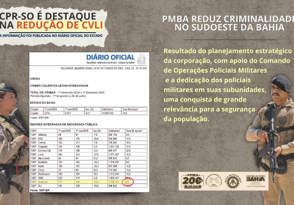 A Região Sudoeste da Bahia apresentou a maior redução nos Crimes Violentos Letais Intencionais (CVLI) de todo o estado no primeiro semestre de 2025, segundo dados da Secretaria de Segurança Pública (SSP-BA).