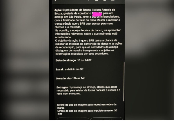 Em um print do convite, divulgado pela coluna, o banco afirma que serão compartilhadas “informações relevantes sobre o que realmente está acontecendo”. A instituição ainda instrui que, após o encontro, os participantes deverão publicar Stories com o conteúdo apresentado, que também serão repostados nos perfis oficiais do BRB.