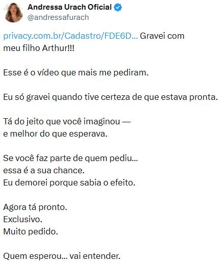 Segundo Andressa, o conteúdo só foi produzido quando ela se sentiu preparada. “Foi o vídeo que mais me pediram. Só gravei quando tive certeza de que estava pronta”, escreveu, destacando que tudo ocorreu dentro da legalidade.