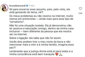 De acordo com Bruna, Virginia já demonstrou que não a respeita, e não tem educação quando se trata dela. “Não foi uma situação isolada. Ela já demonstrou não ter postura e ter educação comigo, dentro da minha casa inclusive, bem diferente que ela mostra ser internet. Sobre a ligação: ela sabe que não foi assim”, disse.