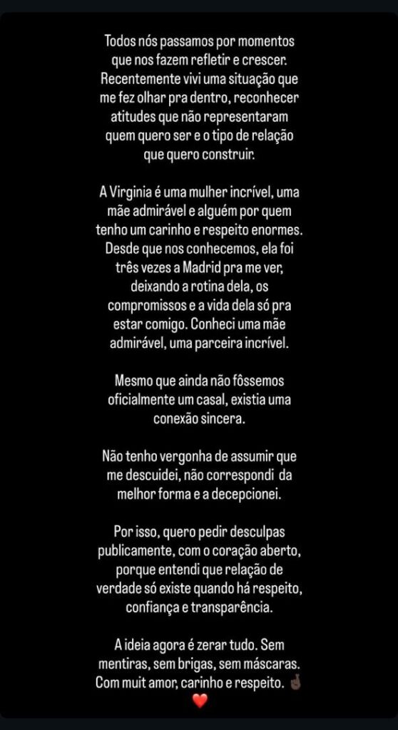 Por fim, Vini pediu desculpa a Virginia e disse que entendeu que a relação só existe quando há respeito e consideração: “Por isso, quero pedir desculpas publicamente, com o coração aberto, porque entendi que relação de verdade só existe quando há respeito, confiança e transparência. A ideia agora é zerar tudo. Sem mentiras, sem brigas, sem máscaras. Com muito amor, carinho e respeito”.