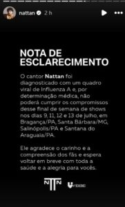 O cantor Nattan cancelou sua agenda de shows desta quarta-feira (9) até domingo (13) os próximos dias após diagnóstico de Influenza A. “O cantor Nattan foi diagnosticado com um quadro viral de Infleunza A e, por determinação médica, não poderá cumprir os compromissos desse final de semana de shows nos dias 9, 11, 12 e 13 de julho, em Bragança (PA), Santa Bárbara (MG), Salinópolis (PA) e Santana do Araguaia (PA)”, diz a assessoria do artista em comunicado.