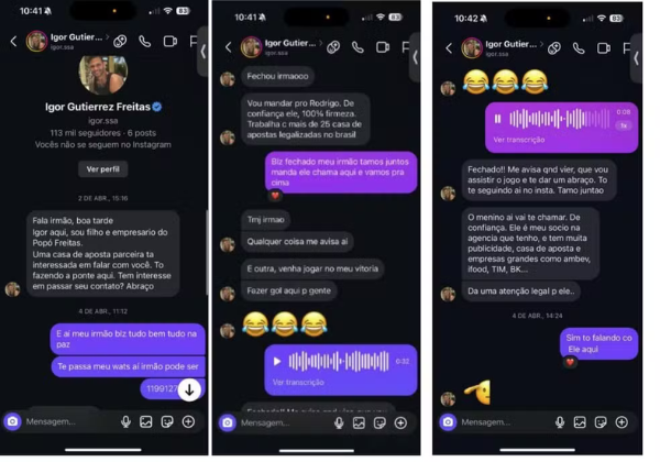 Segundo informações do Globo Esporte, Igor fazia contato com os atletas pela WhatsApp, se apresentando como empresário e filho de Popó. Em seguida, ele enviava o número dos jogadores para seu sócio dar prosseguimento às conversas. Freitas se referia ao colega como alguém que lida “com mais de 25 casas de apostas legalizadas no Brasil”.