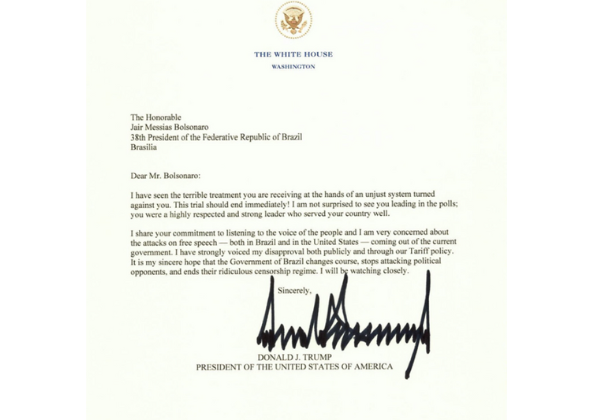 A carta ainda expressa preocupação com a liberdade de expressão no Brasil e nos EUA. Trump afirmou que compartilha com Bolsonaro o compromisso de ouvir a população e condenou o que classificou como “regime ridículo de censura”.