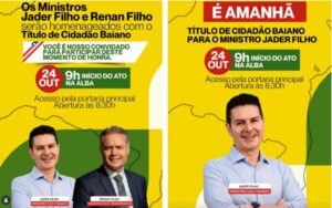 A Assembleia Legislativa da Bahia (Alba) realiza, na manhã desta sexta-feira (24), uma sessão especial para conceder o Título de Cidadão Baiano a dois ministros do governo Luiz Inácio Lula da Silva (PT): Renan Filho (Transportes) e Jader Barbalho Filho (Cidades).