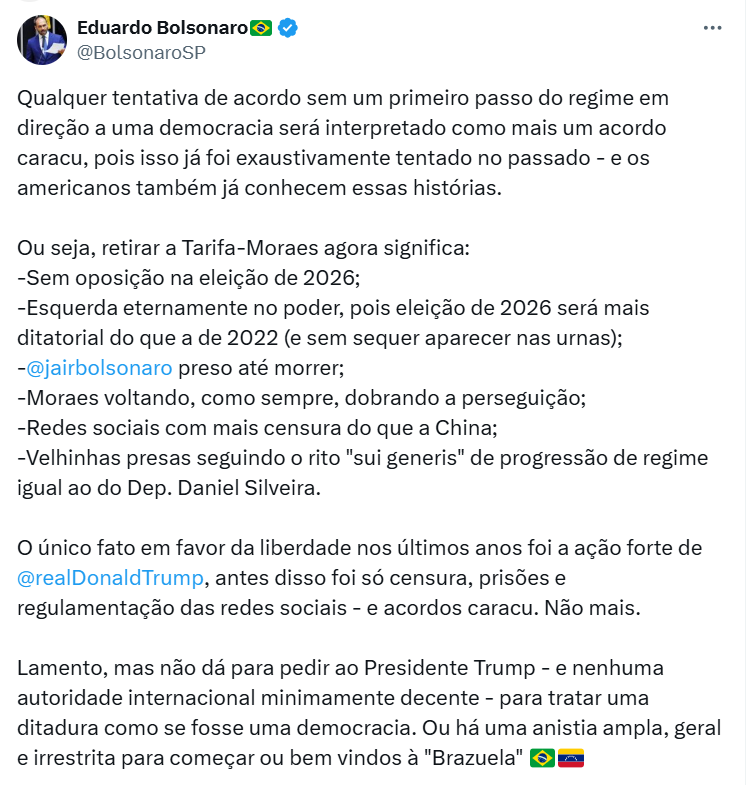 Na publicação, Eduardo também comentou do risco que a suspensão da taxação, que ele chama de “Tarifa-Moraes”, pode trazer ao Brasil, como o risco de se tornar uma “Brazuela’, em referência à ditadura venezuelana.