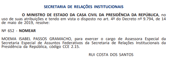 A ex-prefeita de Lauro de Freitas, Moema Gramacho (PT), foi nomeada para o cargo de Assessora Especial de Assuntos Federativos, pasta vinculada à Secretaria de Relações Institucionais da Presidência da República. A nomeação foi publicada na edição do Diário Oficial da União (DOU) desta quinta-feira (29).